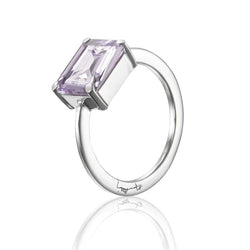 Ring with vintage look in rhodium plated sterling silver with an emerald cut 3.45ct pink amethyst. Band measures 1mm (W) x 2mm (H). Stone measures 11 x 9mm.