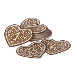 Numbered gift tags for your advent presents. The heart shaped cardboard tags are printed to look like gingerbread. Measures 6.5cm each.