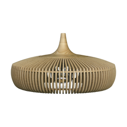 The simplistic lines of the wooden lamellas make Clava Wood suitable for many environments and rooms and elevate the dining table as well as a hallway or bedroom ceiling. The simple yet bold expression of the lampshade, as well as the sophisticated details of the wood, will make the Clava Wood stand out in hotel lobbies, restaurants and cafés.