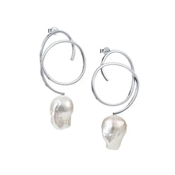 Earrings in a curly shape in recycled sterling silver with baroque pearls. Earring: 65 x 35mm. 2pcs baroque freshwater pearls, 23.5mm x 13.5mm.