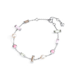 Bracelet in recycled sterling silver with baguette cut smokey quartz, green quartz and pink amethyst, as well as round cut pink tourmaline and freshwater pearls. The bracelet has adjustable length of 16cm, 17.5cm or 19cm. Short décor: 6.5 x 3mm, long décor: 9 x 3mm, round décor: 5.6mm.
