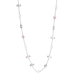 Necklace in recycled sterling silver with baguette cut smokey quartz, green quartz and pink amethyst, as well as round cut pink tourmaline and freshwater pearls. The necklace has adjustable length of 40cm, 42cm or 45cm. Short décor: 6.5 x 3mm, long décor: 9 x 3mm, round décor: 5.6mm.