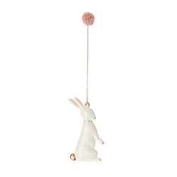 An Easter bunny ornament made of metal with hand painted details and a small rose pompom. Ornament measures H8cm x W4cm.
