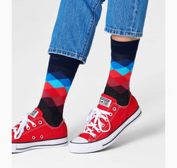 Shades of blue and red add something different to this pair of black socks. The Faded Diamond design covers the top half of the socks while the foot is left solid, so they can be worn subtly under a pair of pants but you'll still know there's playful, hidden twist to your outfit! For a bolder style, they can be worn with a skirt or shorts so the pattern is on full display. Made from combed cotton, this pair of is Sizes available for women and men.
