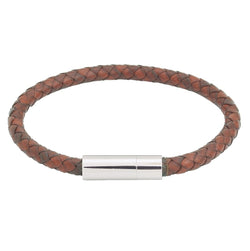 Franky is a stylish menโs braided leather bracelet that makes for the perfect everyday accessory. The bracelet can be seen here in brown leather and features a shiny stainless steel clasp that closes with a slight twist. The bracelet is produced in Sweden by a supplier who specializes in sustainable and traceable production, here with leather from Italy. Diameter 6 mm. Vegetable tanned leather, shiny stainless steel. Nickel safe.