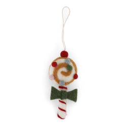 Sweet and whimsical, the Gry & Sif Christmas Candy Decoration with Green Bow is a playful nod to festive traditions. Handmade from New Zealand wool, this felt lollipop features a swirled candy design dotted with colourful candy balls, finished with a charming green felt bow.