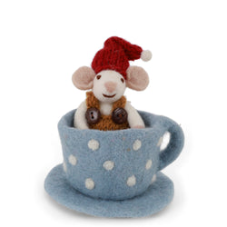 Add a touch of playful whimsy to your Christmas decor with the Gry & Sif Mouse in Blue Coffee Cup. This sweet felt mouse, wearing a red woolly hat and cosy vest, peeks out of a soft blue polka-dot cup complete with saucer - bringing charm and character to festive displays.