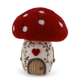 Create a little woodland wonder in your home with the Gry & Sif Mushroom House Decoration – Big. With its bold red spotted cap, arched faux-wood door and delicate embroidered vines, berries and a red heart, this felted toadstool looks straight out of a fairytale forest.
