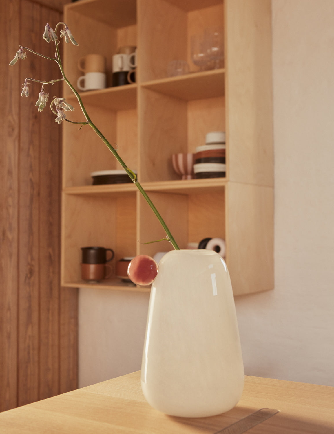 The mouth-blown glass Inka Vase in off-white has a simple and elegant expression, which fits perfectly into all types of home decor. Add your favourite flowers and branches for a beautiful statement piece. Measures 20cm (H) x 12.5cm (Dia).