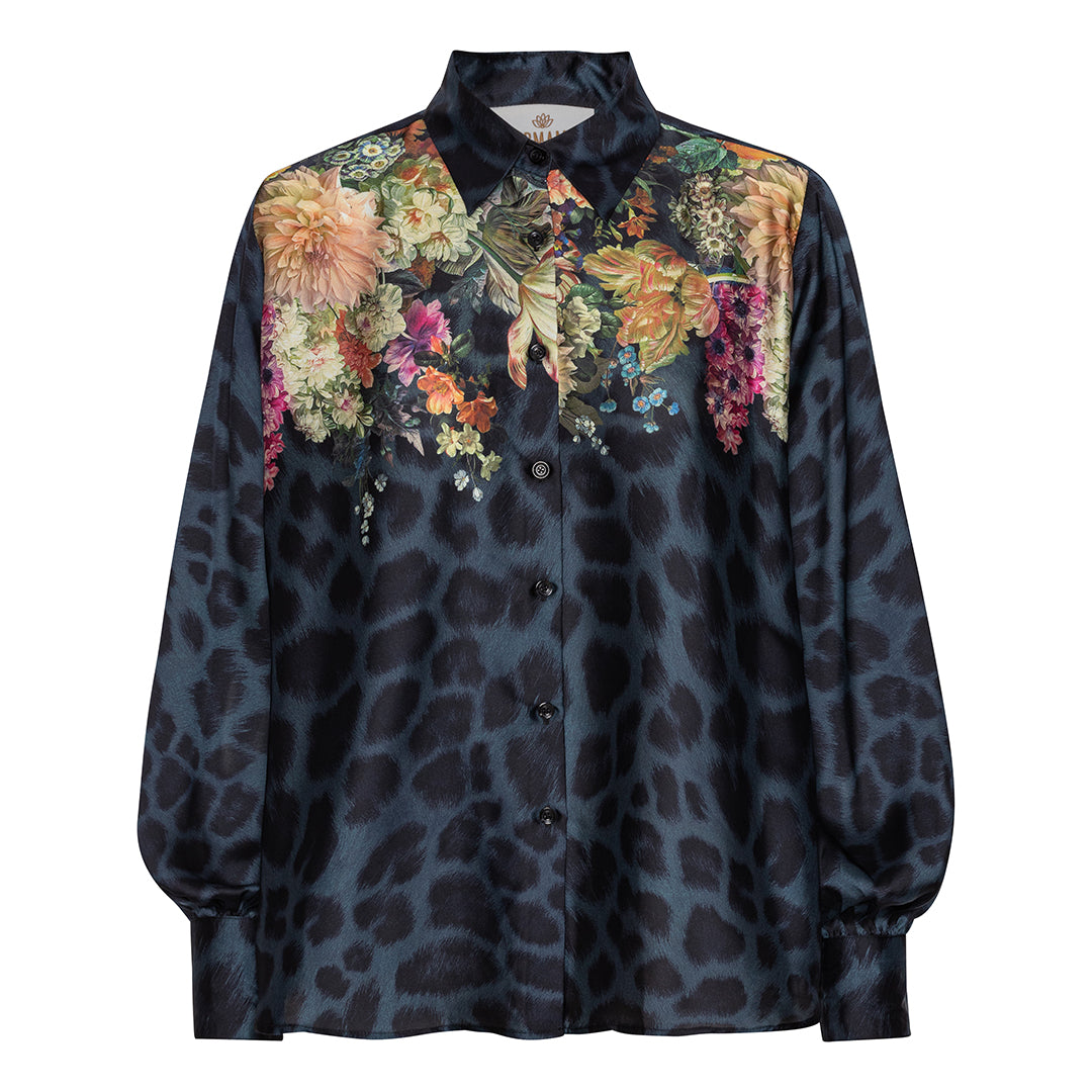 Feminine button-down shirt with voluminous sleeves, classic collar and elegant pleating details on the back. Made of satin-woven recycled polyester.