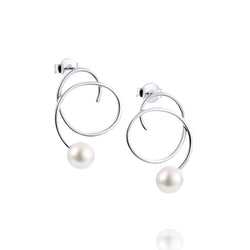 Earrings in recycled sterling silver with with a curly shape and sweet water pearls. Earring: 25 x 18mm. 2pcs round freshwater pearls, 7mm.