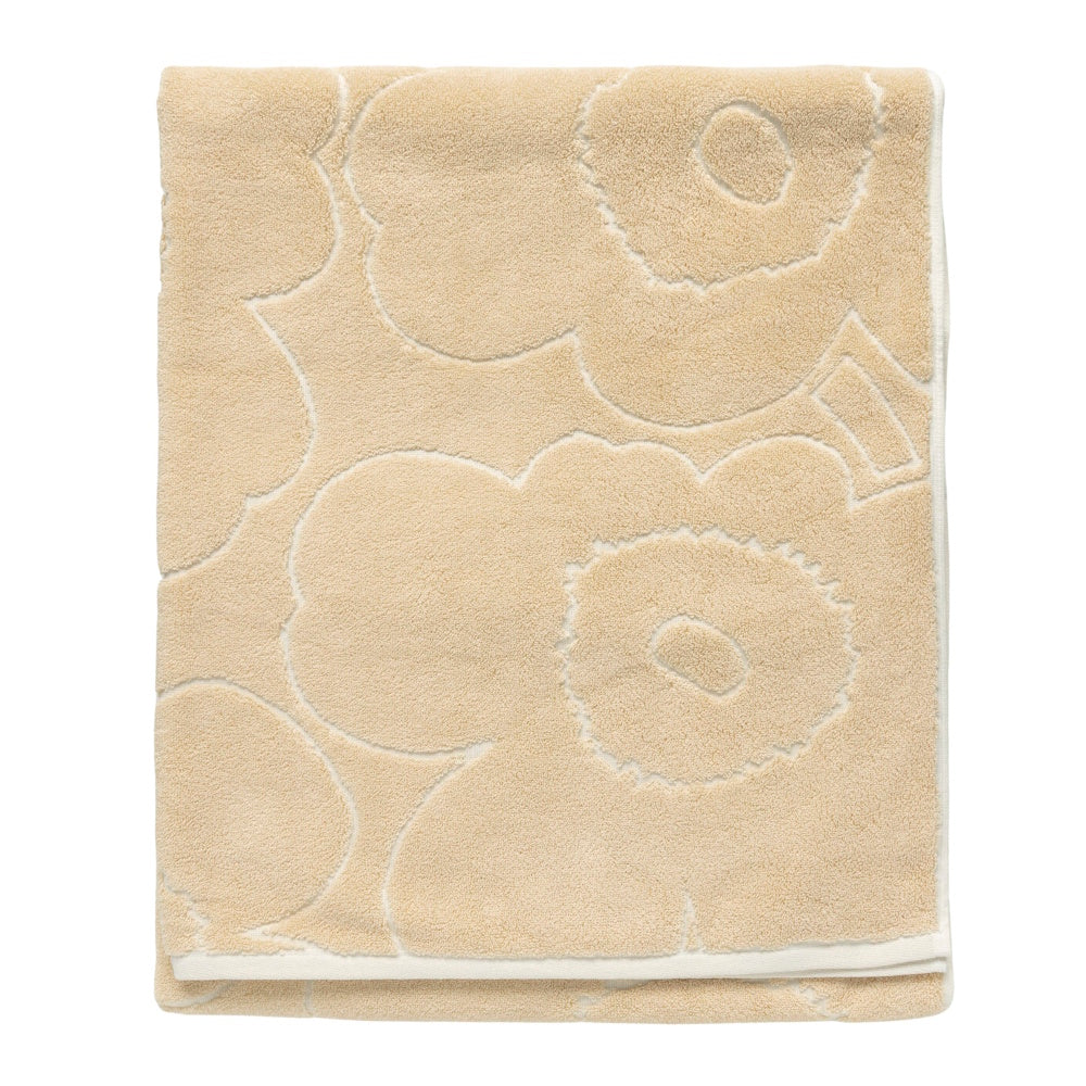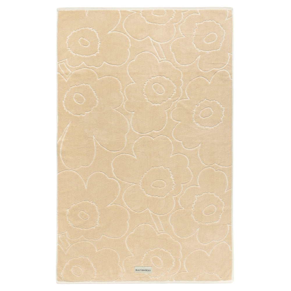 This bath towel is made of organic cotton terry. The towel features the debossed Piirto Unikko pattern on one side and the Marimekko label on the bottom edge. Piirto Unikko is a stylized, airy variation of the beloved floral created by Maija Isola in 1964. It nods to minimalism while emphasizing the graphic lines of the Unikko pattern.