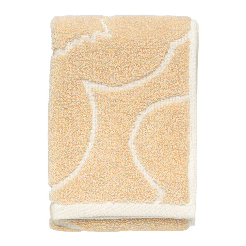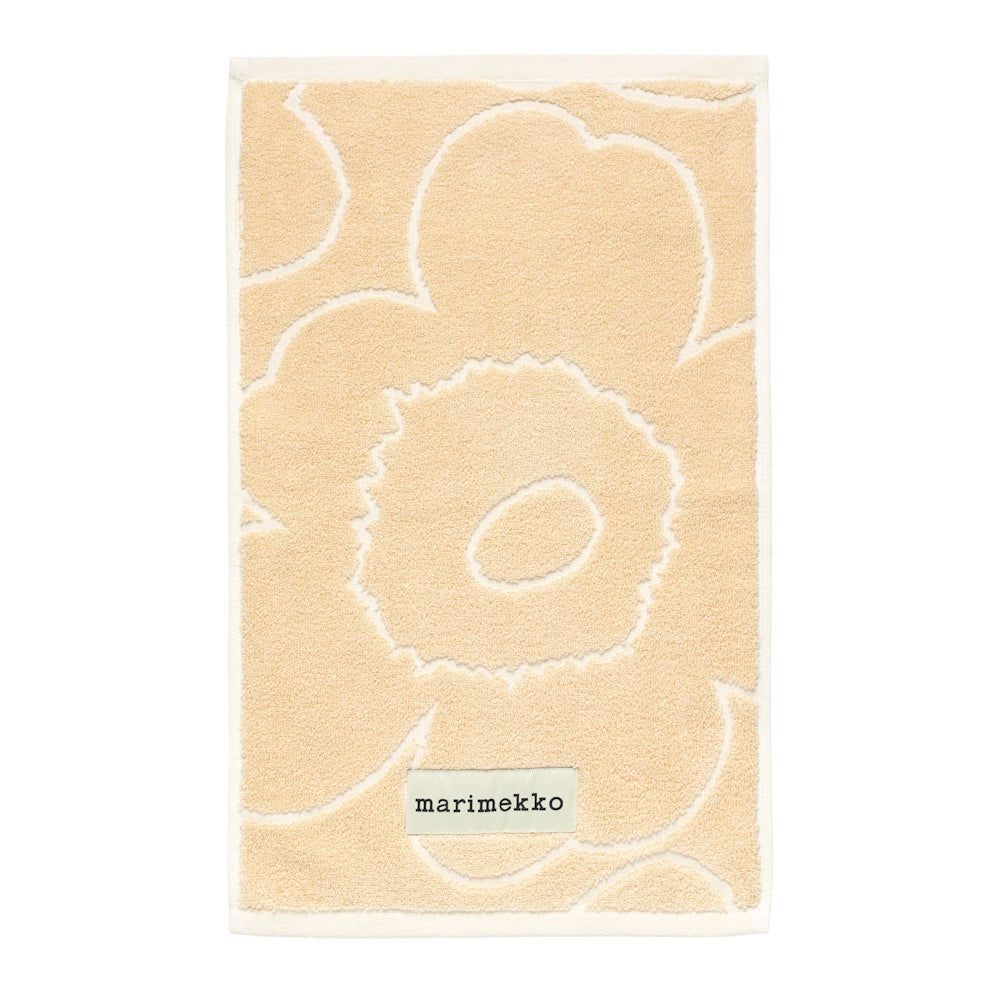 This guest towel is made of organic cotton terry. The towel features the debossed Piirto Unikko pattern on one side and the Marimekko label on the bottom edge. Piirto Unikko is a stylized, airy variation of the beloved floral created by Maija Isola in 1964. It nods to minimalism while emphasizing the graphic lines of the Unikko pattern.