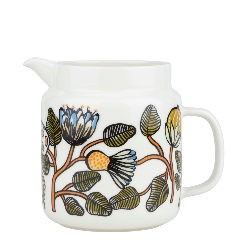 This Oiva jug features the Tiara pattern. Made of dishwasher, microwave and oven safe stoneware. In the exuberant Tiara pattern designed by Erja Hirvi, different kinds of plants and flowers are featured as nature’s crowning glory. Measures H15cm x Ø11cm.