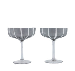 Serve your favourite champagne, cocktail or dessert in these striped coupe glass from OYOY. The Mizu series is characterized by an elegant, light and modern expression which catches everyone's attention. The coupe glass is designed with a long neck, combined with the large and open bowl. Each glass is unique as it is mouth blown, with handmade details. Comes in a set of two. Capacity 230ml. Measures H14cm x Ø11.5cm. Dishwasher safe.