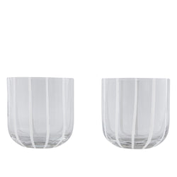 Set an elegant table with these striped tumblers from the Mizu series. Characterized by a graceful and modern expression that fits well into the contemporary home. The glasses are ideal for serving all kinds of drinks. Each glass is unique as it is mouth blown, with handmade details. Comes as a set of two. Capacity 320ml each. Measures H8.2cm x Ø8cm. Dishwasher safe.