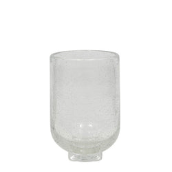 The Kuki Hurricane in glass features bubble splashes that add a touch of whimsy to its minimalist design. Its sturdy base adds a playful element to its timeless aesthetic, blending functionality with elegance. Perfect for holding candles, flowers or as a decorative piece. Being mouthblown, each hurricane will vary in size, adding to its unique charm. Measures H12cm x W8cm.