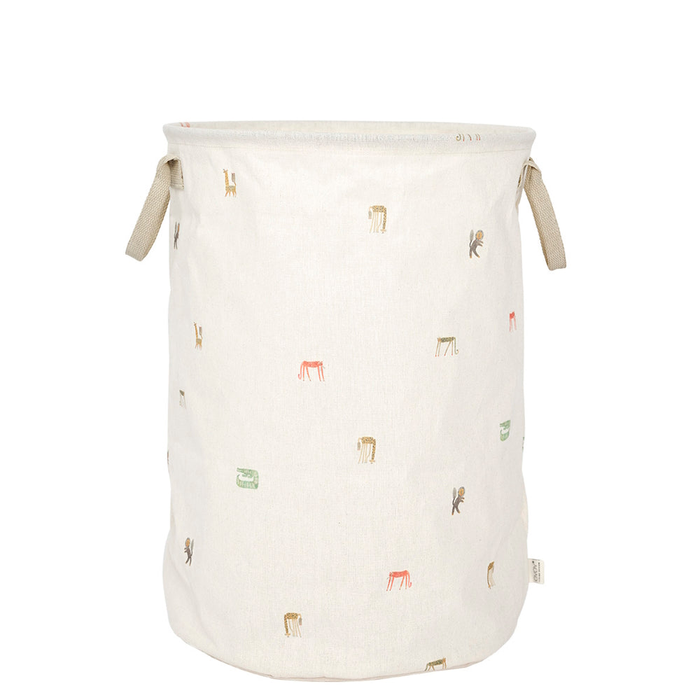 The drawings of the well-known OYOY animals on the Moira basket are made in collaboration with the English artist Moira Frith. This makes the Moira basket a captivating piece that adds charm and character to your child's room. The basket features an array of adorable animals, including giraffes, lions and crocodiles. Let your child's imagination roam free as they embark on their own expedition while tidying up their toys, clothes or other belongings. Measures Ø40cm x H54cm. Made of polyester and cotton, with a PE coating.