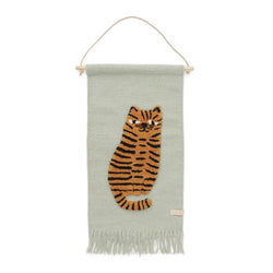 The Tiger Wall Hanging is a decorative and playful addition to your child's room. This fun and unique artwork will add a whimsical touch to your child's space, featuring a dimensional effect they will love. Handmade with care, it is crafted from a blend of 95% wool and 5% cotton. Includes the wooden stick and string for hanging. Measures L70cm x W32cm.