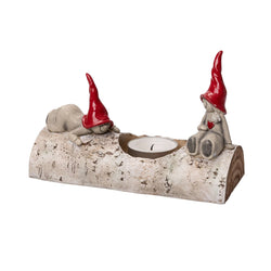 Playful and heartwarming, the Naasgransgarden Peek-a-Boo Candleholder is a charming addition to your festive décor. Featuring two sweet gnomes in tall red hats - one peeking over a birch-effect log and the other sitting with a little heart - this ceramic candleholder is designed to hold a tealight in the centre. The natural wood-like finish and whimsical figures capture the essence of Nordic Christmas traditions, making it perfect for tables, mantels or as a thoughtful seasonal gift. Measures 15.5cm in length.