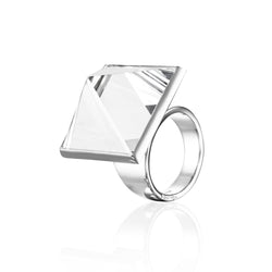 Ring in recycled rhodium-plated sterling silver with a mini Love Bowl with brilliant-cut diamonds under a pyramid-shaped rock crystal that gives the illusion of four Love Bowls. Tapered shank: 12-5x2mm. Décor: 24.5x24.5mm with Prisma. Diamonds: total approx. 0.14ct tw/si brilliant cut.