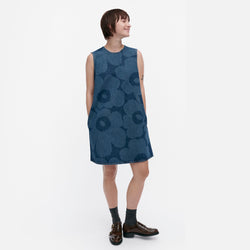 The Somasti Unikko Maridenim Dress in Indigo is a fresh take on Marimekko's iconic floral print. Crafted from sturdy cotton denim, this sleeveless A-line dress features the beloved Unikko (poppy) pattern in a rich tonal jacquard weave. Its clean silhouette, round neckline, and timeless indigo hue make it a versatile piece for effortless everyday style. Pair it with layers or wear it solo for a bold, artistic statement rooted in Scandinavian design.