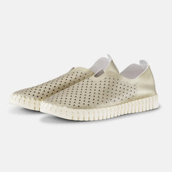 Step out in understated elegance with the Ilse Jacobsen Tulip Shoes in Platin. Designed in Denmark, these lightweight slip-ons feature a metallic-hued recycled microfibre upper with laser-cut detailing for breathable comfort. The flexible natural rubber sole offers ease of movement, while the cushioned insole ensures all-day wear. The soft platinum shade adds a subtle shimmer, making them perfect for both casual days and elevated occasions. Sustainably crafted and easy to pack, the Tulip in Platin blends Scandinavian simplicity with a touch of glamour.