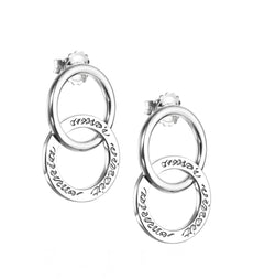 Large statement earrings in sterling silver with a squared and rounded ring. One ring is engraved with Amor Vincit Omnia - love conquers all in Latin.Β