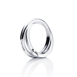Ring in recycled sterling silver with two rings linked together. One round ring and the other one flat with a signature. Shank: round 3mm, square w 2 x h 2.5mm.